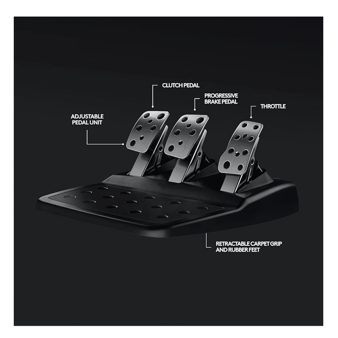 Throttle, pressure-sensitive brake, and clutch pedals let you accelerate, brake and change gears with the feel of an actual car. For finer control, reposition the pedal faces for easy heel-toe maneuvers. Rubber feet and a retractable carpet grip system keep your pedals right where you put them.