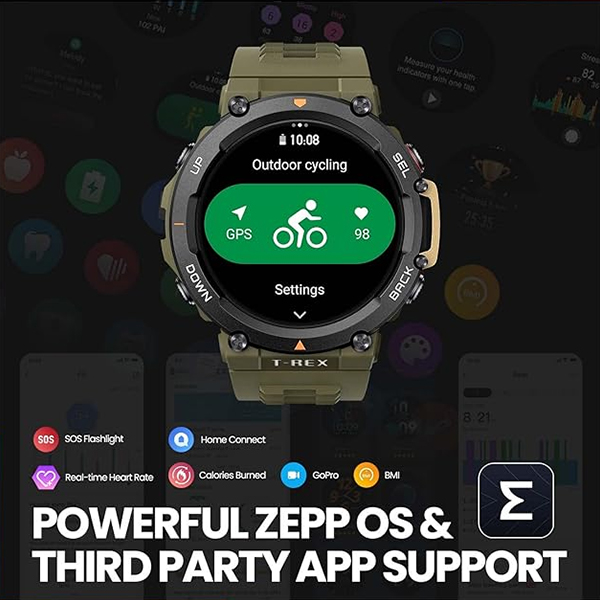 - [Powerful Zepp OS & 3rd Party App Support] The intuitive Zepp OS makes it easy to find what you’re looking for on your Amazfit T-Rex 2 smart watch. Seamless interactions, and a specifically tailored smartwatch UI, enhance the user-experience of this light and low power-consuming OS. You can experience a mini app framework with a rich ecosystem including 10+ mini apps and even the Home Connect and GoPro third-party apps.