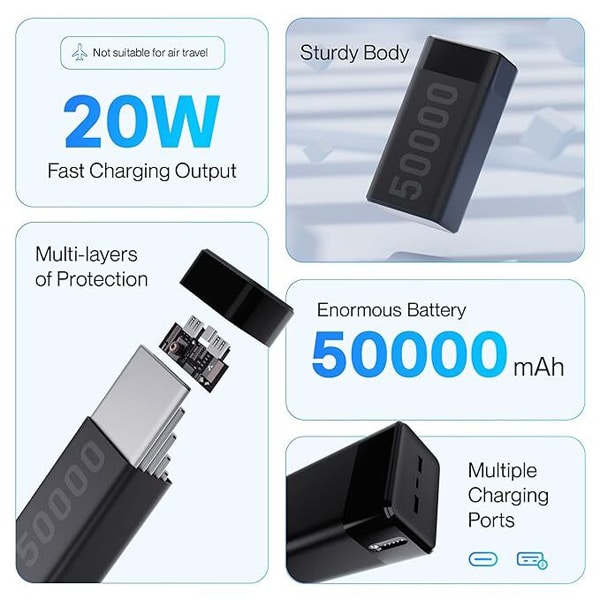 - Gigantic 50k mAh Capacity- Lithium-Polymer 50,000mAh capacity allows you to charge your devices multiple times.