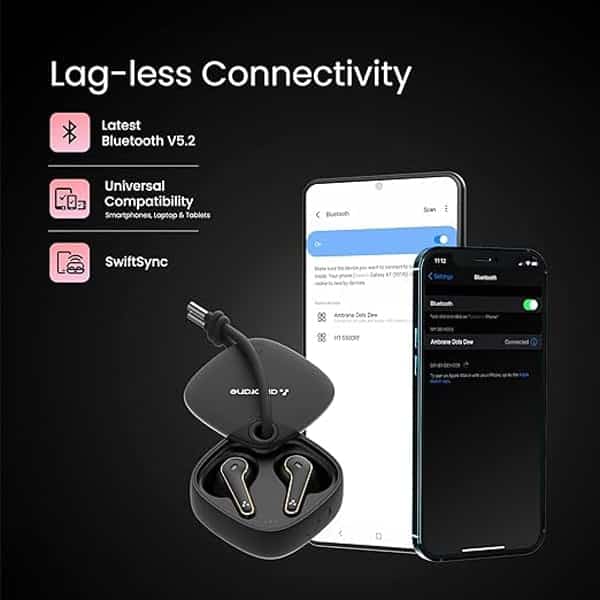 - True Masterpiece of Entertainment is here! Now block the external noises and stay entertained with Ambrane Dots Dew true wireless earbuds. Its latest Bluetooth V5.2 provides lag-less and seamless listening sessions. These true wireless earbuds come with good playback time so that you can enjoy non-stop. The minimalist size and ultra-lightweight make it the perfect go-to partner for your musical experience.