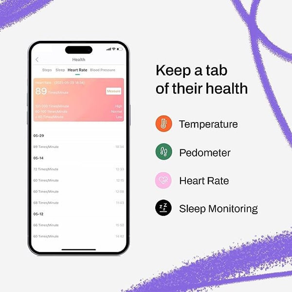 - Health Monitoring: Fitshot Junior monitors your child’s health by tracking their heart rate, body temperature, sleep quality, and blood pressure.