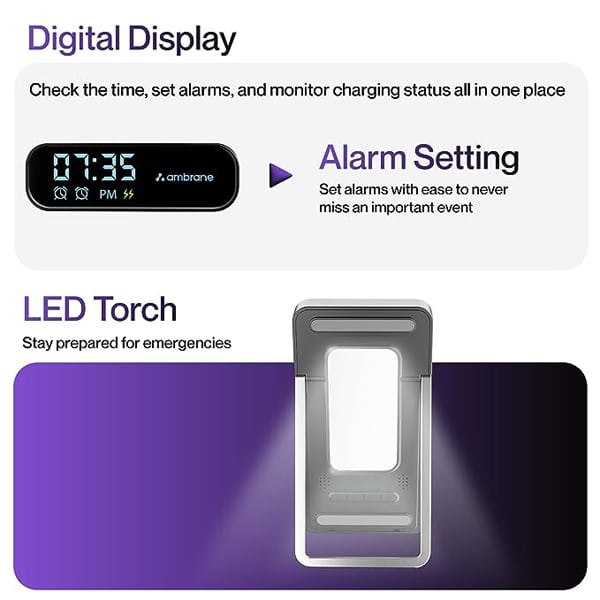 - Ultimate Convenience: Enjoy ultimate convenience with the Ambrane PowerPod Pro. Its digital display keeps you informed of the time, alarms, and charging status, while the built-in LED torch provides a handy emergency light source.