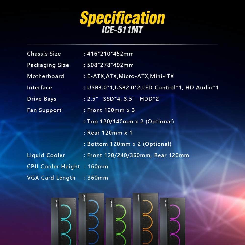 Ant Esports ICE-511MT Mid Tower Gaming Cabinet Top Magnetic Dust Mesh, Black Glossy Finish, Transparent Tempered Glass Side Panel, 3 x 120mm Auto RGB Front Fan and 1 x 120 mm Rear Fan, Cable Management Support, Support Mainstream ATX, MICRO-ATX, MINI-ITX Motherboard, 7+2 Expansion Slot, Support Vertical VGA Card, Cabinet Dimension : 416 x 210 x 452 mm. 1 year warranty (valid from date of purchase) important: accidental damage and faults resulting from improper use (e.g. Operating errors, mechanical damage, incorrect operating voltage) are not covered in warranty.
