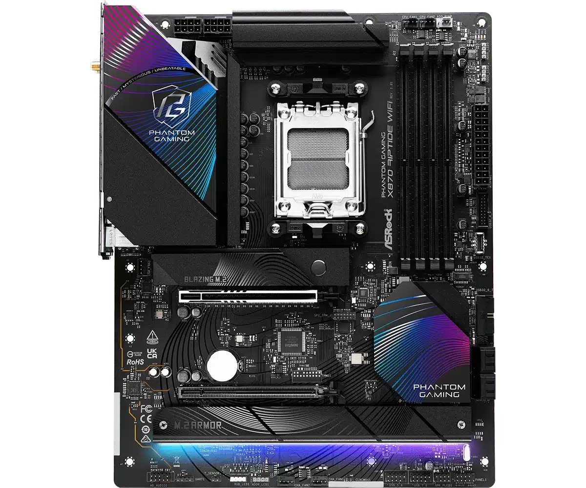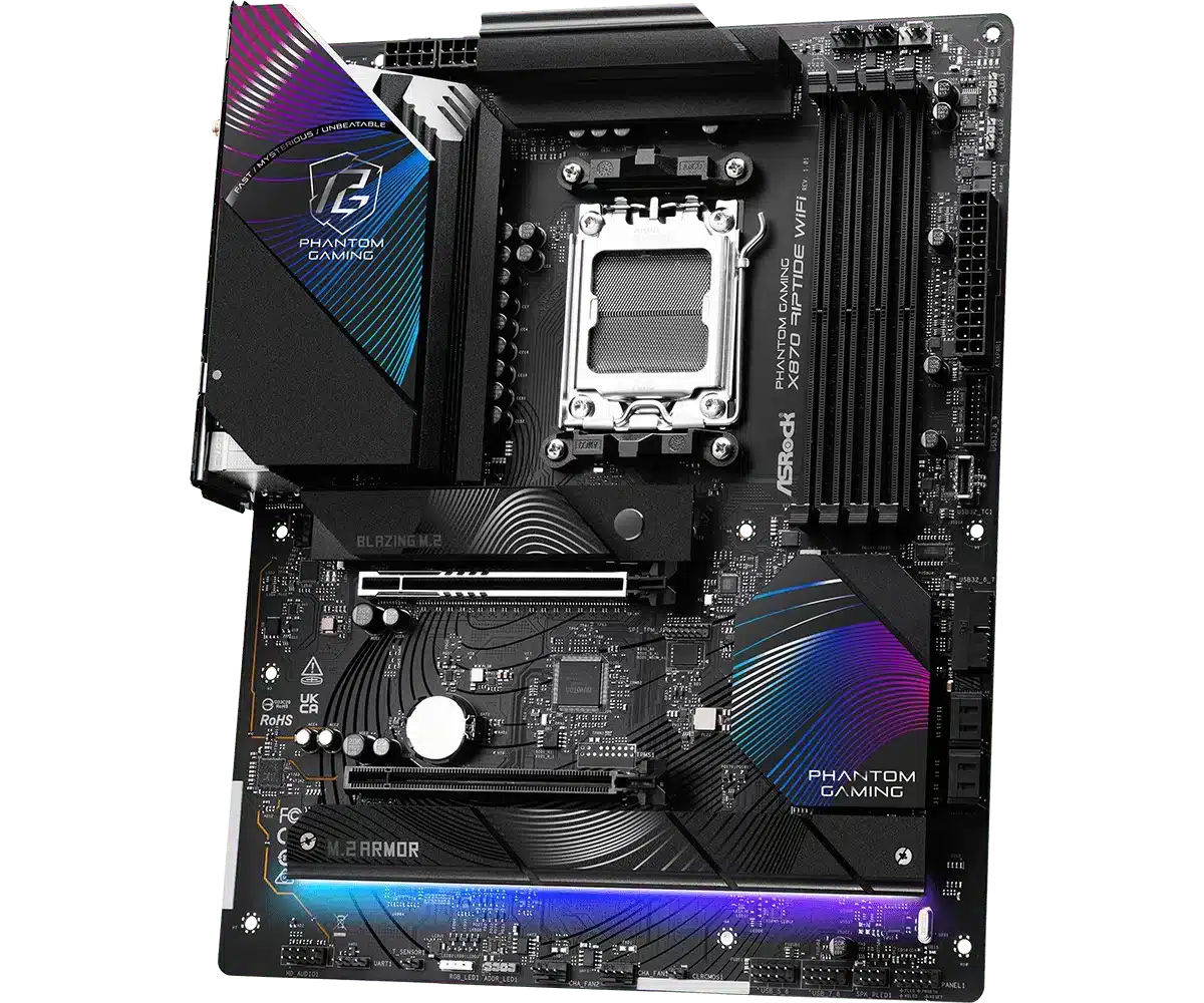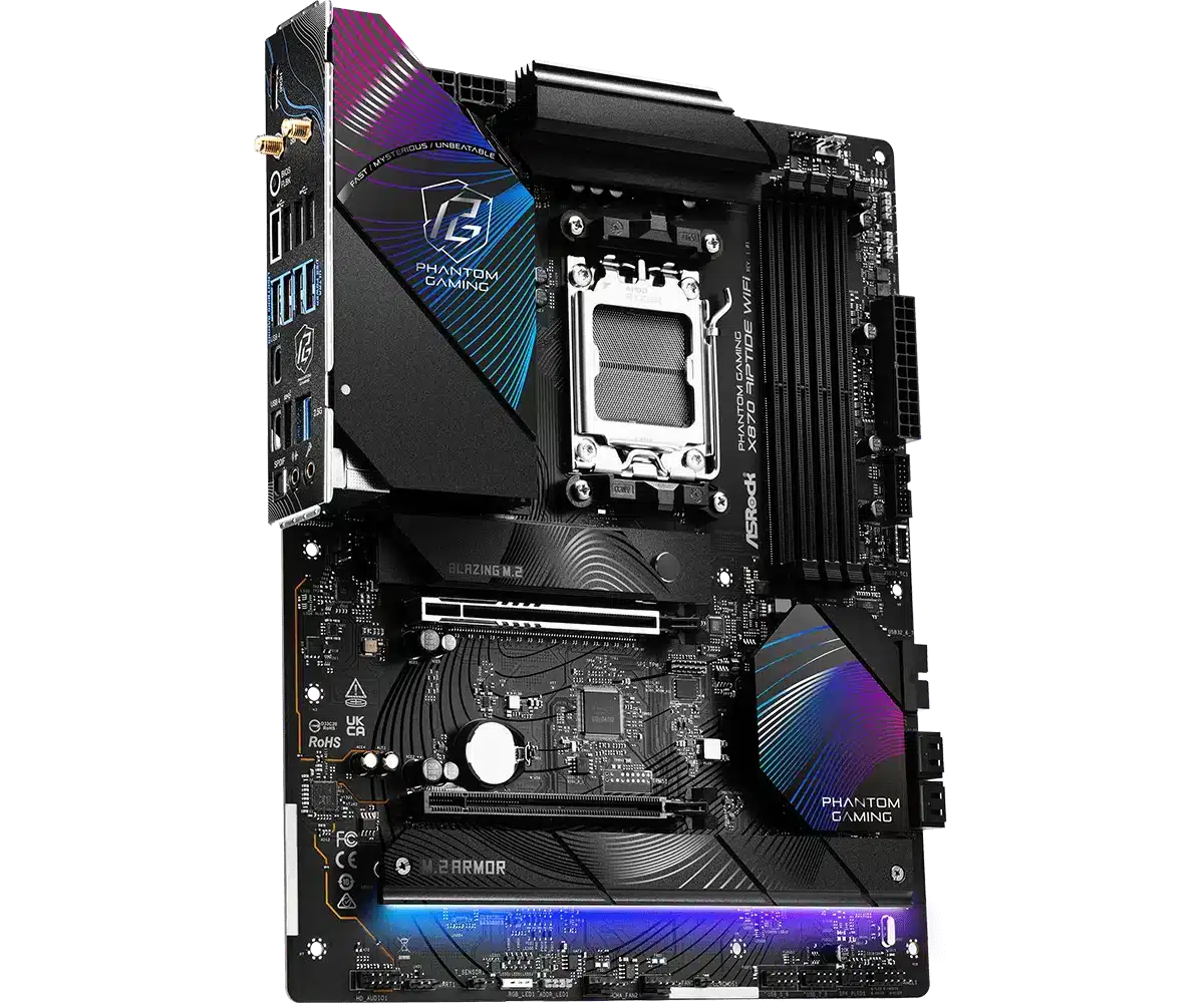ASrock X870 Riptide WiFi Phantom Gaming Motherboard is named after a specific kind of water current with strong waves that occurs in the ocean, representing the philosophy of sea’s double-side, calm and unlimited strength. Built around powerful gaming-related features, the Riptide has given a powerful smash and immersed users in the sense of stability.