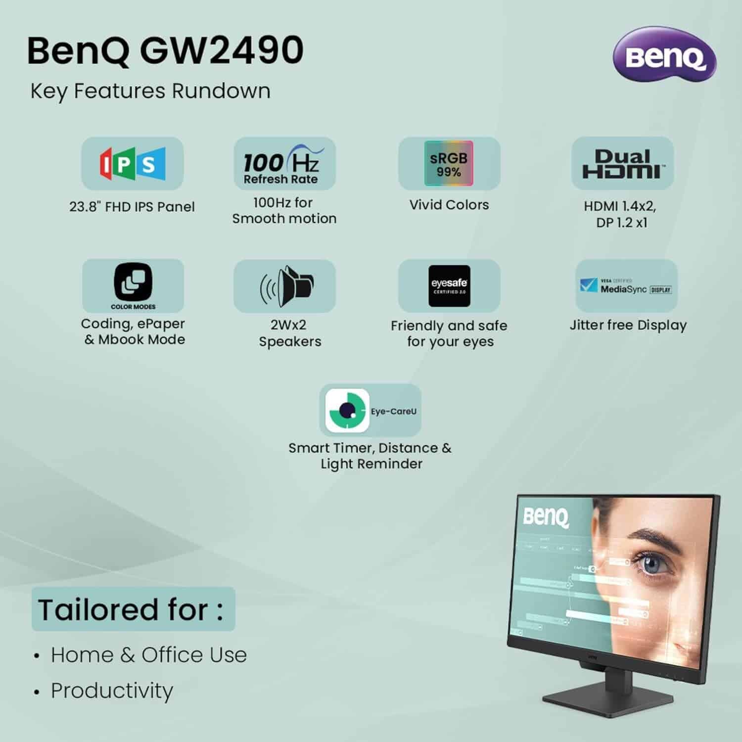- Eye-Care Technology: Includes BenQ’s Brightness Intelligence (B.I.), Low Blue Light+, and Flicker-Free technology to reduce eye strain.