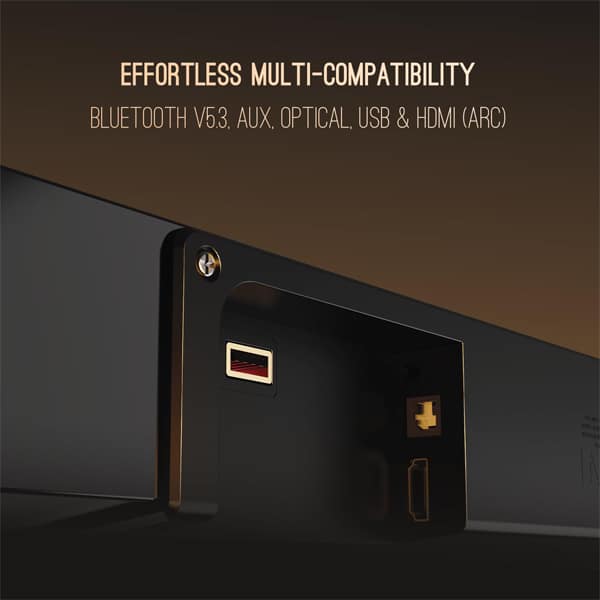 • Multichannel Connectivity: Game and stream with an array of connections both wired and wireless. Equipped with AUX, optical, HDMI (ARC), and USB ports, along with wireless Bluetooth v5.3 technology, dive into the audio using this soundbar in a matter of minutes!