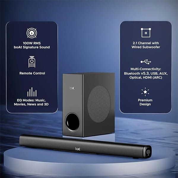 - Power– Experience boAt Signature Sound with 100W R.M.S premium audio delivered by Aavante Bar Mystiq soundbar.