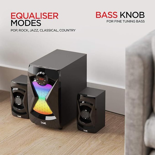 It’s time to enjoy a playback experience like never before courtesy boAt Blitz 1500, the 2.1 Channel Multimedia speaker with RGB LEDs. The RGB LEDs pave the way for making the ambience suit a lot more to the music being played and set the right vibe! Its 50W thumping sound with subwoofer offers sheer musical bliss. It supports instant wireless connectivity with Bluetooth v5.0. Apart from the wireless connectivity, the user has other options in the form of AUX, USB, SD Card and FM?modes as well. The listener has options for EQ adjustments in the form of POP, ROCK, JAZZ, CLASSICAL & COUNTRY EQ modes. One can even tune the bass via the Bass Knob. The exquisite build uplifts the vibe of the whole room while you control the playback seamlessly courtesy the remote controller.