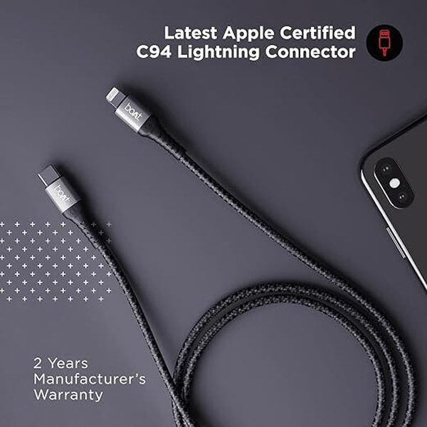 • The boAt LTG 650 Apple MFi Certified Type C to Lightning Cable is compatible with all iPhones, iPods, iPads and other lightning devices with this charging type.