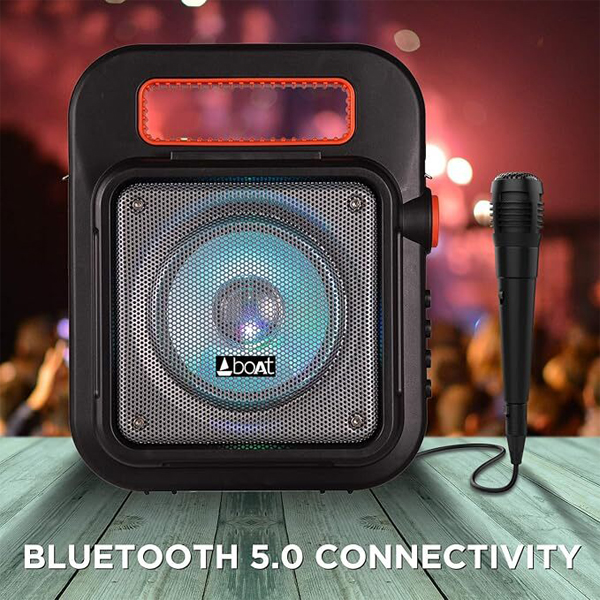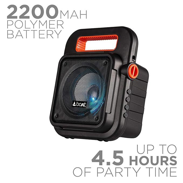 Turn up the atmosphere and party from dusk till dawn with the boAt PartyPal 20. Fitted with HD Sound at 15WâÂÂs, turn your precious FridayâÂÂs into just what you need, a little stress release! The party rhythm never slows down with a Play-time of up to 4.5 hours, and a 2200mAh rechargeable lithium battery. ItâÂÂs time to get really loud, with the microphone jack and recording feature that allows for memorable karaoke sessions. So, power through your week with the anarchic attitude of the PartyPal 20, the speaker that just wonâÂÂt give up. Connect to sensational sound and bring the 6.5â full range driver to life using Bluetooth V5.0, Aux, USB and FM Radio connection. Hold the speaker aloft and bring the dance party to life with the LED lit speakers that can be switched on with just the click of a button. Dynamic, Versatile and Powerful. You canâÂÂt beat the boAt PartyPal 20. Access the wide range of controls with ultra-ease and sail with the high tides when youâÂÂre rocking with the boAt PartyPal 20. ItâÂÂs time to turn up the atmosphere.