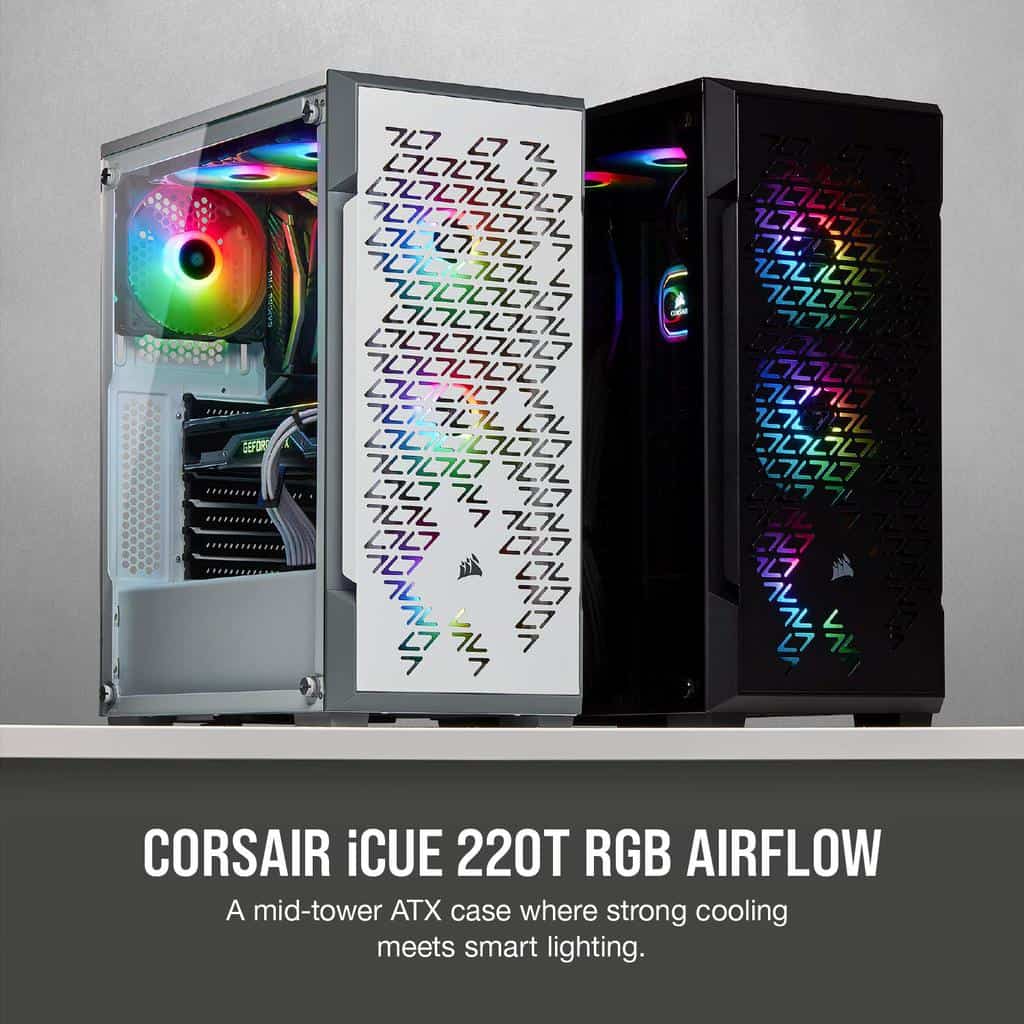 The Corsair iCUE 220T RGB airflow is a mid-tower ATX Smart case with a steel grill front panel for incredibly high airflow Create spectacular lighting with three included SP120 RGB PRO fans. Featuring eight individually addressable LEDs each controlled via Corsair iCUE software. House your PC in durable solid steel with a frameless tempered glass side panel to show off your components. Keep your build tidy with a full-length PSU cover along with flexible storage options. To fit up to four drives With room for up to six fans or three radiators and removable dust filters to keep your system clean the 220T RGB airflow is where strong cooling meets smart lighting.