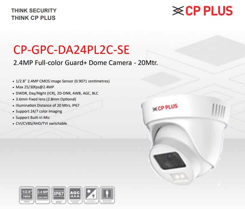 Image Sensor1/2.8″ 2.4MP CMOS (0.9071 centimetres) Minimum Illumination0.01Lux/F1.6, 0 Lux white light on BodyTypeDome Shutter SpeedPAL: 1/25~1/100000s NTSC: 1/30~1/100000s Max ApertureF1.6 White BalanceAuto/Manual Lens TypeFixed Lens3.6mm (2.8mm Optional) Gain Control (AGC)Auto/Manual DORI Distance2.8mm: 43.9m (Detect) 17.5m (Observe) 8.8m (Recognize) 4.4mm (Identify) 3.6mm: 55.2m (Detect) 22.1m (Observe) 11.0m (Recognize) 5.5mm (Identify) Angle of View2.8mm: 126.2° × 106° × 56.5° (diagonal × horizontal × vertical) 3.6mm: 103.6° × 86.9° × 46.3° (diagonal × horizontal × vertical) S/N Ratio>65dB Back Light Comp.BLC/ DWDR Video StreamingCVI: PAL: 1080P AT 25fps; 720P AT 25fps; NTSC: 1080P AT 30fps; 720P AT 30fps; AHD: PAL: 1080P AT 25fps; NTSC: 1080P AT 30fps TVI: PAL: 1080P AT 25fps; NTSC: 1080P AT 30fps; CVBS: PAL: 960H; NTSC: 960H Privacy MaskOff/On (8 area, rectangle) Video OutputVideo output choices of CVI/TVI/AHD/CVBS by one BNC port Audio InputBuilt-in Mic Illumination DistanceIllumination Distance of 20 Mtr., Smart Light Operating Temperature-40°C ~ +55°C; Less than <95% RH (non-condensation) Power Source12V DC ±30% Power ConsumptionMax 3.1W (12V DC, White Light on) Weatherproof StandardIP67 Dimensionφ97 mm × 86.6 mm CasingPlastic