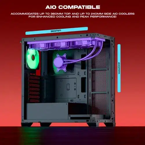- Superior Cooling Support: Pre-installed 4 ARGB fans for excellent airflow. Supports up to 10 fans for enhanced cooling. Radiator support: Up to 360mm (top) & 240mm (side) for liquid cooling setups.
