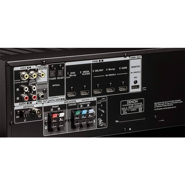AVR-X250BT 5.1 Ch 4k Ultra HD AV receiver is exactly what you would need to enhance your experience of watching movies , listening songs or playing games at home on your TV or gaming console.Now watch your favourite shows with full 4K Ultra HD and easily connect your media components and gaming systems to the five available HDMI inputs or stream music with built-in Bluetooth. This brand new Denon X250BT receiver has 130 W per channel output with five HDMI inputs and one output and supports a full 4k ultra HD display with Dolby Vision and HDCP 2.2 support as well. Through front panel USB and Bluetooth, almost every format of music can be streamed on it. The 5.1 channel AVR-X250BT features Bluetooth for wireless music streaming from any compatible device and remembers up to eight paired devices.