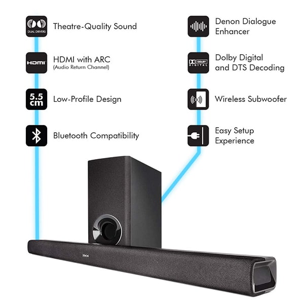 - Transform any TV into a home entertainment center with the Denon DHT-S316. The low-visibility, wall-mountable sound bar features high-fidelity sound with two-way speakers and a wireless subwoofer. Denon Virtual Surround technology creates a powerful, realistic home theater experience through Dolby Digital, DTS Decoding and the Denon-proprietary Dialogue Enhancer for crystal clear dialogue at any volume. Easily connect your TV to the HDMI (with Audio Return Channel) with the included HDMI cable