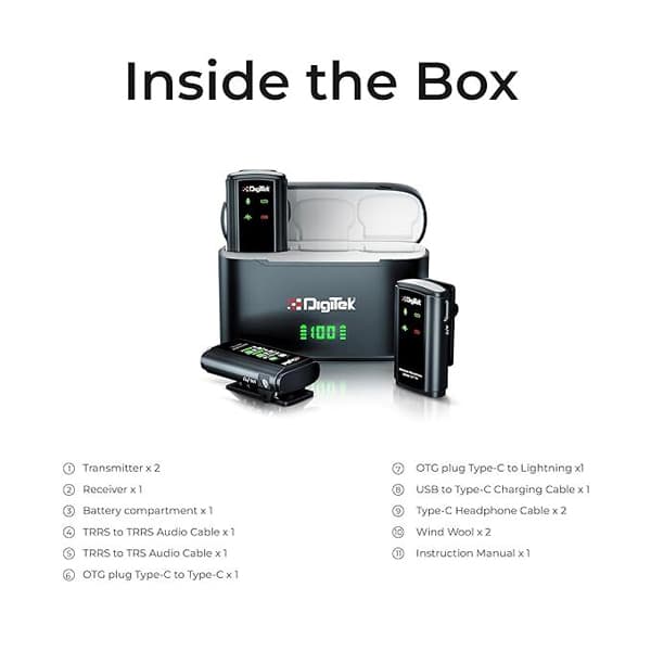 - Included Components: TRRS to TRRS Audio Cable x 1Nos., OTG plug Type-C to Lightning x1 Nos., Receiver x 1 Nos., Battery Compartment x 1 Nos., Transmitter x 2 Nos., Type-C Headphone Cable x 2 Nos., Wind Wool x 2 Nos. & Instruction Manual x 1 Nos., TRRS to TRS Audio Cable x 1 Nos., USB to Type-C Charging Cable x 1Nos., OTG plug Type-C to Type-C x 1 Nos.