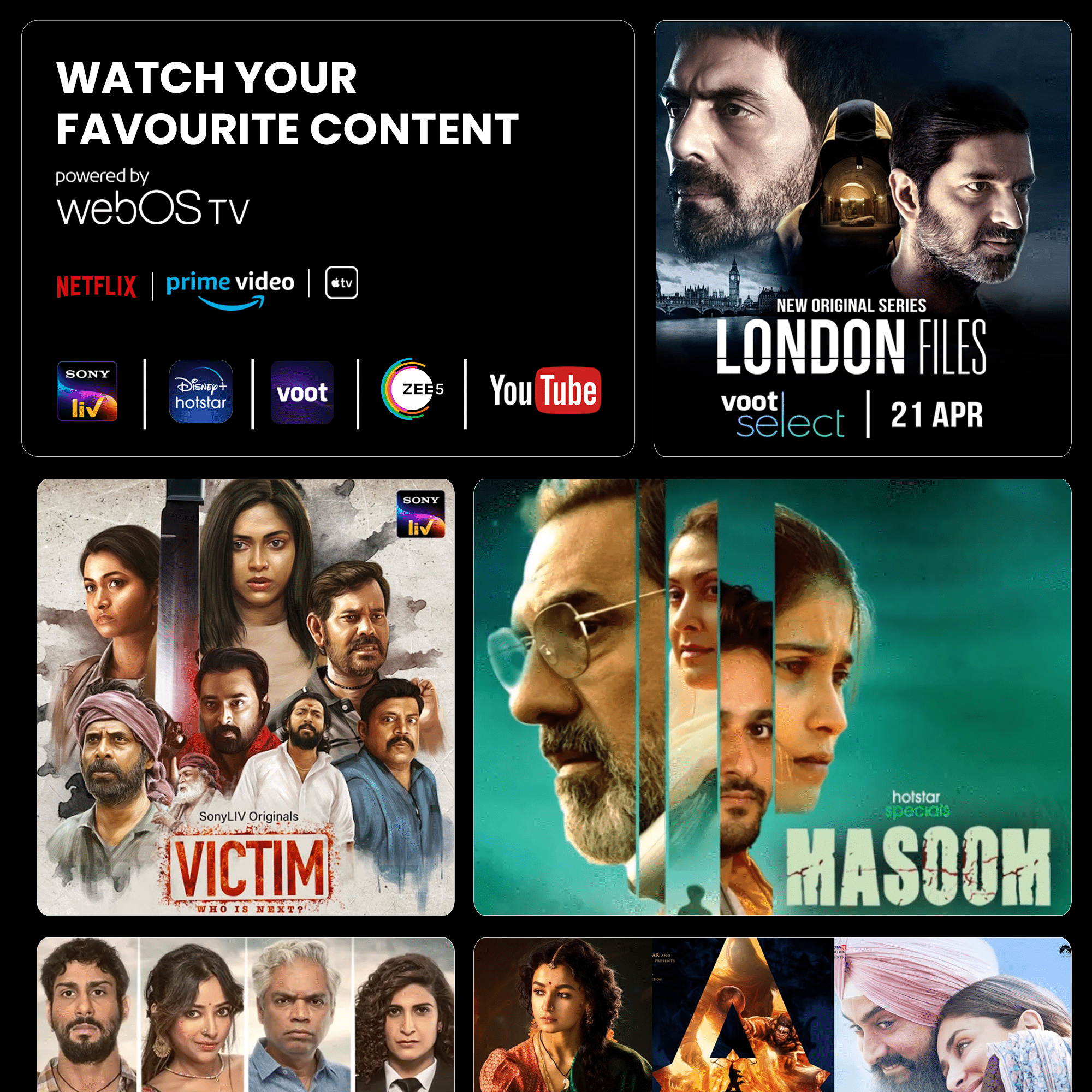 • Smart TV Features: Smart WebOS TV | ThinQ AI | Alexa Voice Assistant | Miracast | E-Share | Dual Band Wi-Fi | 1.5 GB RAM | 8GB ROM | In-Built Apps: Netflix | Prime Video | Disney+Hotstar | Youtube | Sony Liv | Zee5