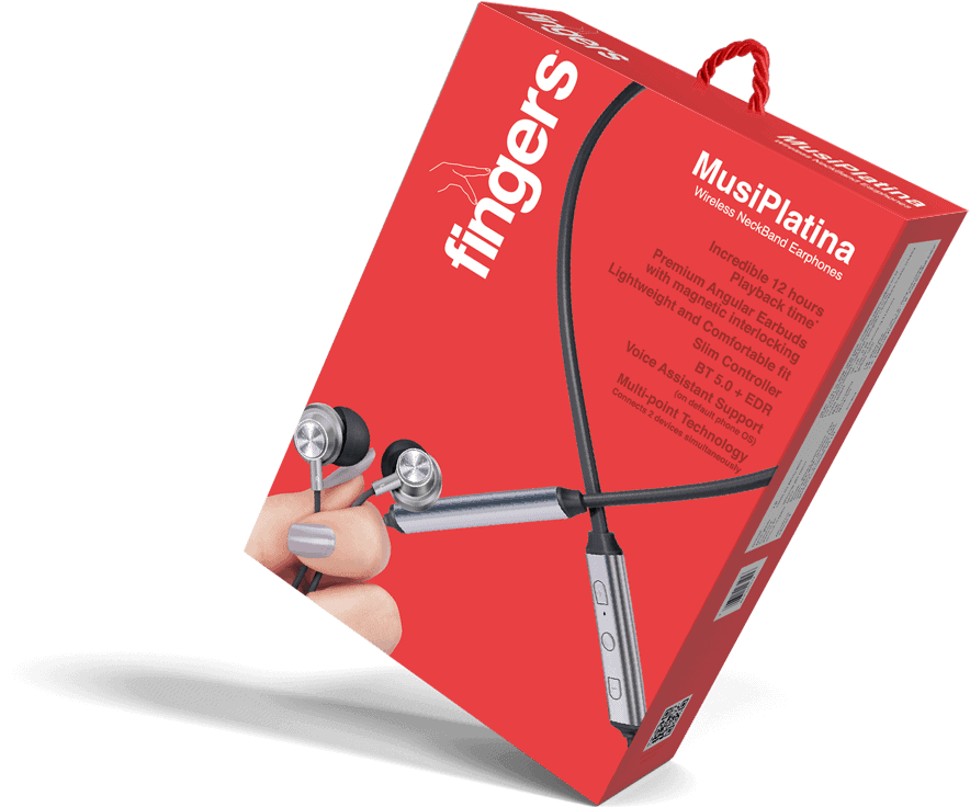 Enjoy Platinum standard of music with FINGERS MusiPlatina wireless neckband earphones. An eye-catching sleek design complemented by trendy Black + Gun Metal shade gives it a futuristic appeal. Offering clear, powerful sound filled with rich bass tuned to Indian ears, it oozes 12 hours of non-stop beats. MusiPlatina all about all day music coupled with comfort, with an ultra-light neckband and a sleek 3-button controller for quick music control and calls.