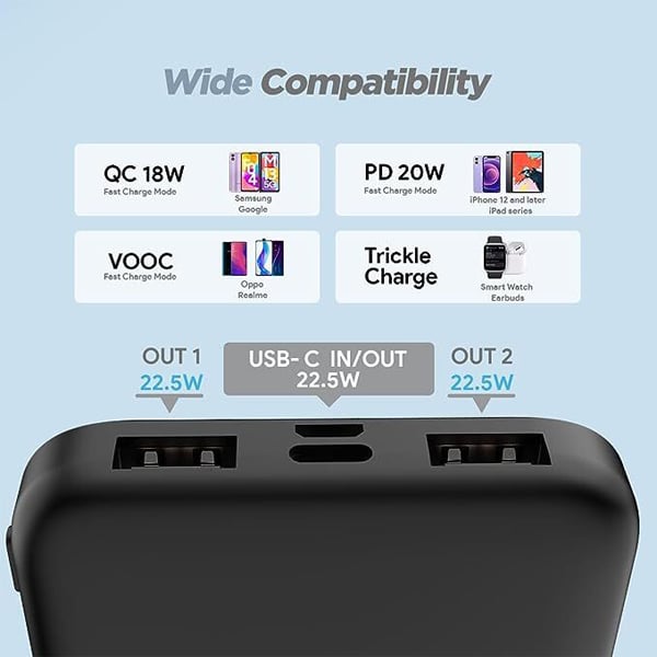 - [Compatibility]- This is a universal Powerbank which can charger all the devices like mobile phones, Tablets, Headphones / Neckbands, Smartwatches and many more, supports all new models Smartphones like iPhone 14, iPhone 13, iPhone 12, iPhone 11, Samsung Galaxy S23 Samsung Galaxy S22, Samsung Galaxy S21, Samsung Galaxy Z Fold 3/4, Samsung Galaxy Z Fold 4, Google Pixel 7, Google Pixel 6, Oneplus 11, Oneplus 10, Vivo V21, Vivo V25, Redmi Note 12, Realme 11 Pro and many more