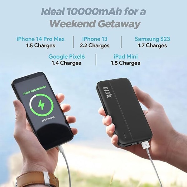 - [High-Capacity Battery]- The 10,000mAh capacity provides ample power to keep your devices charged throughout the day. It offers multiple recharges for your smartphone iPhone Pro Max 1.5 charges, iPhone 13 2.2 charges, Samsung S23 1.7 charges, Google pixel 6 1.4 charges, ipad Mini 1.5 charges or other USB-powered devices, ensuring you stay connected whenever and wherever you need it