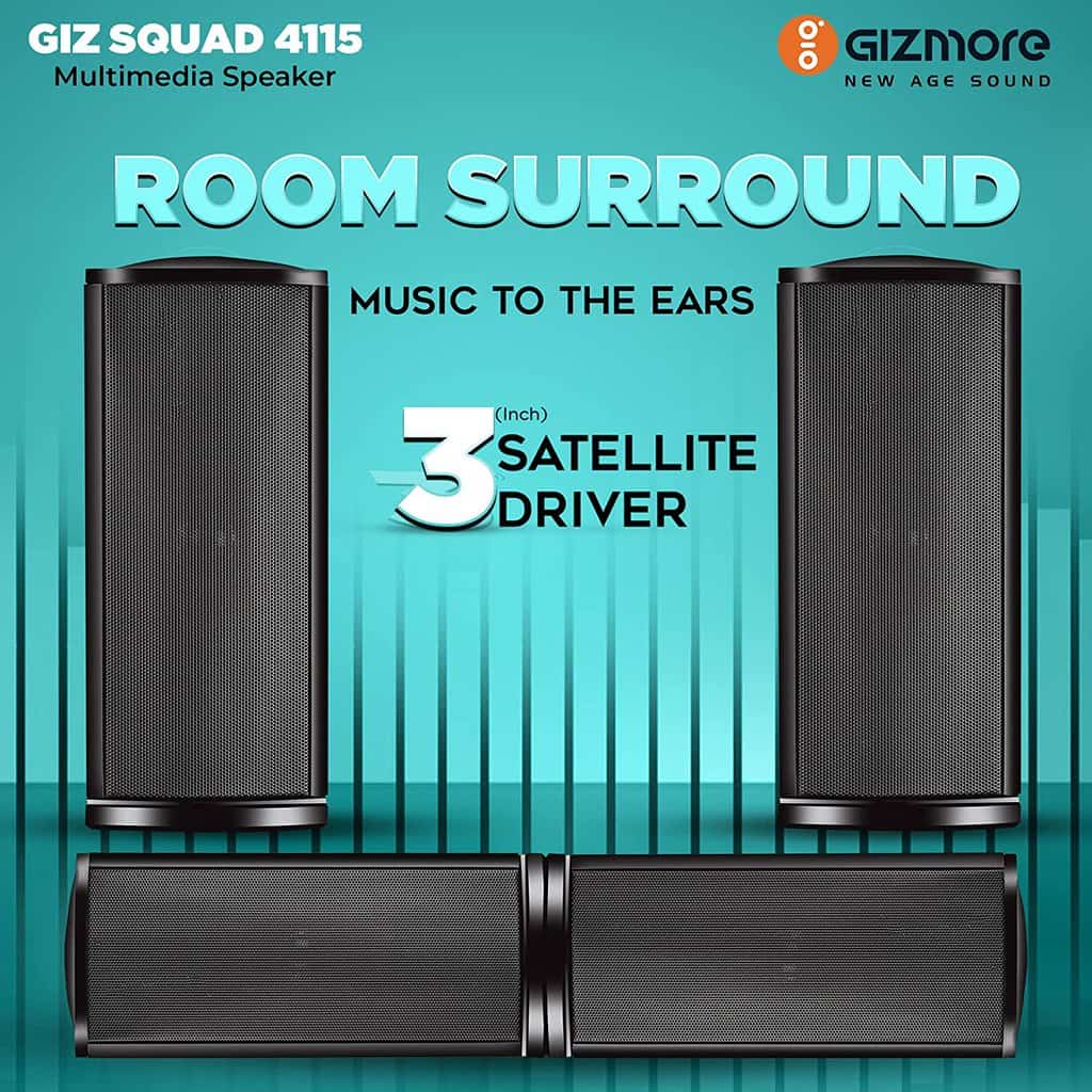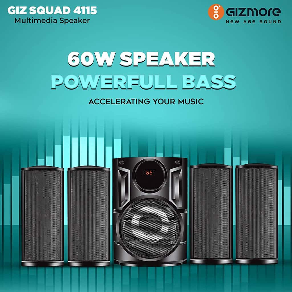SLEEK DESIGN WITH WOODEN PREMIUM FINISH The Hot New Gizmore GIZ SQUAD 4115 Multimedia Speaker is a Made in India 4.1 speaker with a splendid design and powerful sound. 4.1 Shelf System with Sound LED Display with Bluetooth, USB, and AUX FM Radio & Micro SD Card Input offer you and your home an elevated audio experience. With strong, clear and vibrant sound quality this wired shelf system will bring a smile to your face while filling your home or office with the sounds of your favourite tracks. The LED Display lighting element adds a subtle allure that enhances your visual and audible experience. Special touch to the songs you know and love. As well as 4 additional wired shelf speakers which may be angled to convey the sound to each corner of your musical enjoyment space of choice. Delivers super sound with a 4″ woofer driver and four 3″ Satellite drivers, all housed in a wooden cabinet to enhance your listening experience