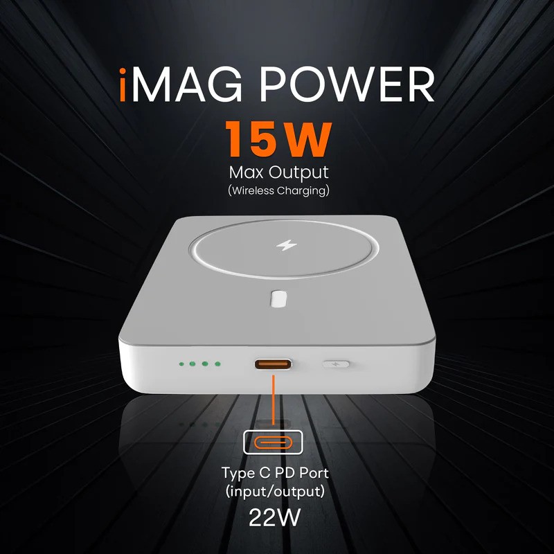 - Meet the GIZMORE iMAG POWER Magnetic Wireless Charging Power Bank, a sleek and versatile power bank designed for your charging needs. It offers 15W wireless charging on iPhone + 22W wired charging on other devices, and a 10000mAh battery for multiple on-the-go charges. With single port for input and output, it’s compatible with various devices specially iPhone 12,13,14 & 15 which are compatible with MagSafe. Its stylish rubber finish ensures a secure grip and its super lightweight makes it perfect for your daily commute or when you’re on the go. Plus, there’s an LED Power indicator so you can always see the power levels and know when you need to refuel. Stay powered up in style with this compact and smart charging solution.
