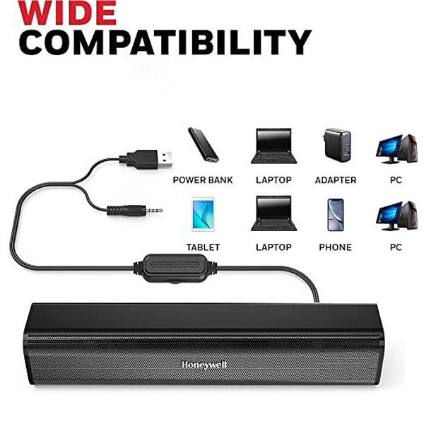 - You can connect the soundbar “USB” with wide range of devices (Laptop, Desktop, USB Wall Chargers, Power Banks) and 3.5 mm AUX to sound source (with Laptop, Desktop, Tablet, Smart Phone) and enjoy hours of high-definition music
