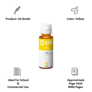 Enhance the performance of your printer with HP GT52 Yellow Ink Bottle. This serves to be an ideal selection for you to maximize your work efficiency and to get the best results. With unparalleled HP quality and reliability, this dye-based ink supports you to print easily. It helps you to achieve high quality printing output and gives you the page yield of about 8000 pages at an extremely low cost per page. This ink bottle is compatible with HP Desk Jet GT series all-in-one model printers. It comes with a six month limited warranty which ensures you a great service even after purchase against manufacturing defects. So get the best out of your printing machines and excel at your work.