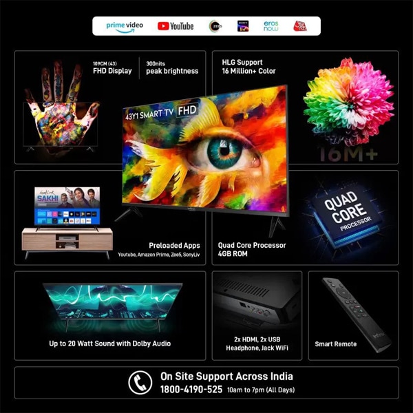 On the Infinix 43Y1 Smart TV, you don’t need to download any additional apps in order to enjoy unlimited streaming of movies, TV shows, and other content. Thanks to the variety of OTT applications that are already pre-installed on it, including Prime Video, Youtube, SonyLiv, Zee5, and more.