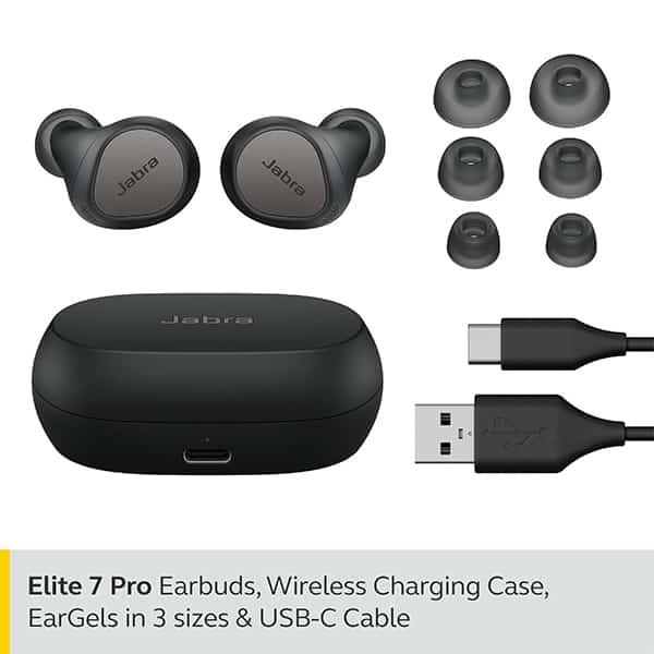 - In the box: 1x Jabra Elite 7 Pro In Ear Wireless Bluetooth Buds, Charging Case, EarGels in 3 sizes, USB-C Cable, Earbud weight: 5.4g, Colour: Black. All in frustration-free packaging.Product comes with a 2-year warranty – registration required