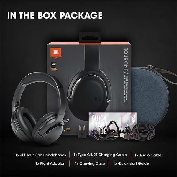 • IN THE BOX PACKAGE: 1 x JBL Tour One headphones, 1 x Type-C USB charging cable, 1 x Audio Cable, 1 x Flight Adaptor, 1 x Carrying case, 1 x Quick Start Guide, 1 x Google Assistant set up guide, 1 x Amazon Alexa set up guide, 1 x Warranty / Warning (W / !), 1 x Safety Sheet (S / i)