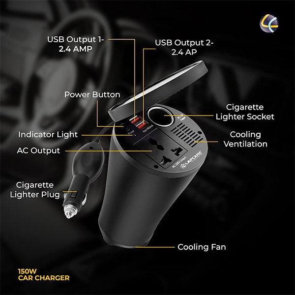 - Provided with cooling fan and universal socket with Cigarette Lighter Socket with 2 USB Port
