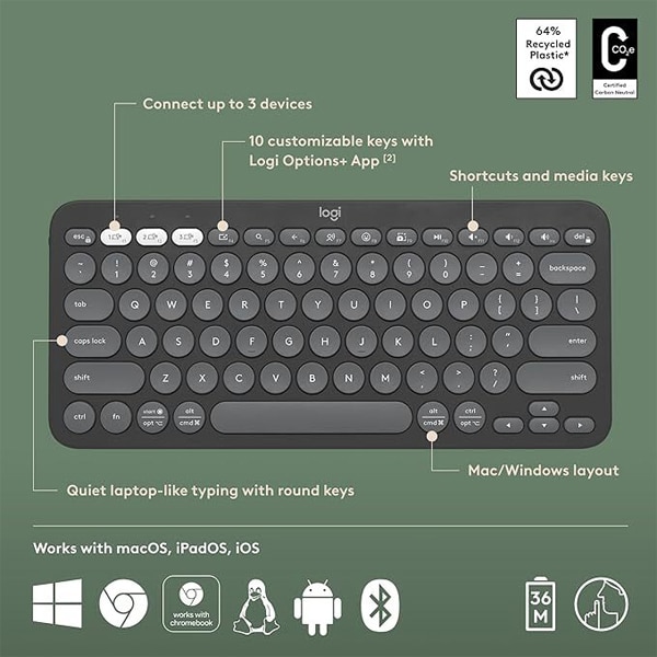 - Easily Hop Across 3 Devices: Use Bluetooth to connect up to 3 wireless devices across OSs (Windows, macOS, iPadOS, ChromeOS), and switch between them with one click of the Easy-Switch buttons