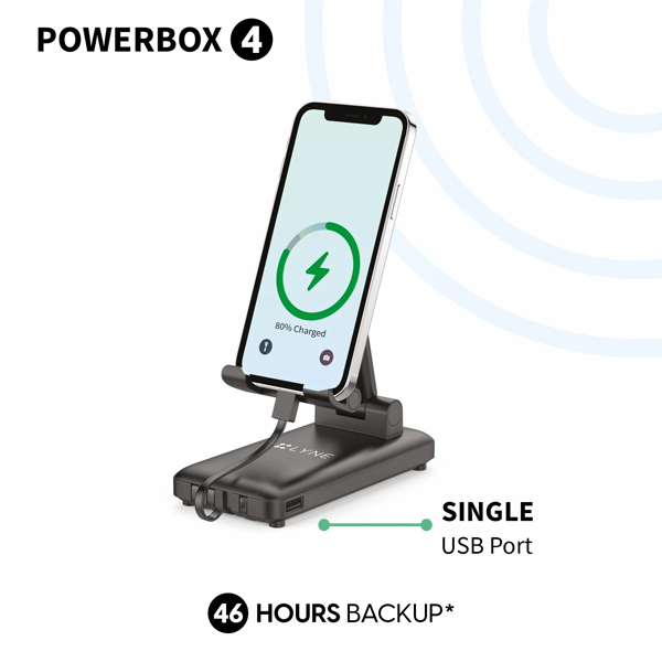 - Your perfect travel buddy, Powerbox 4 provides an attach mobile stand and cable helping you save your space and time. The mobile stand helps keep your device steady and within your vision hence providing you a comfortable view of your mobile screen without any hassle.