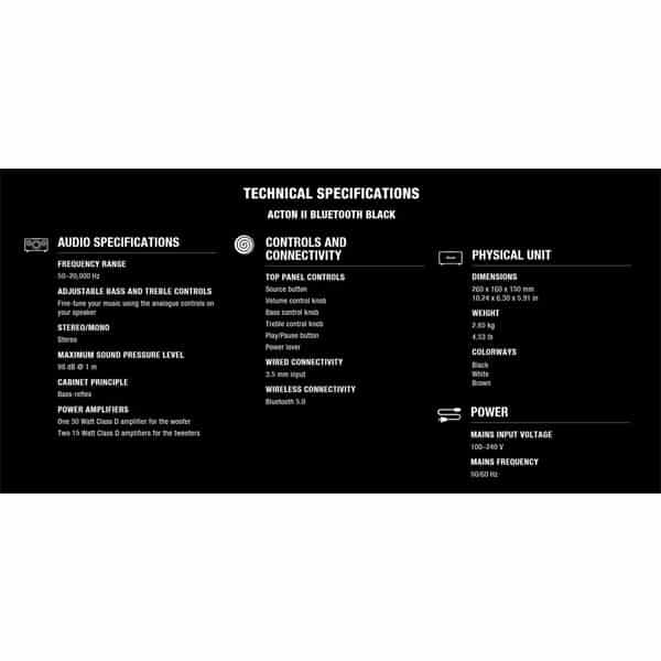 - IN THE BOX: Acton II Bluetooth Speaker, Mains Lead, Quick Start Guide, Legal and Safety Information