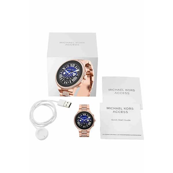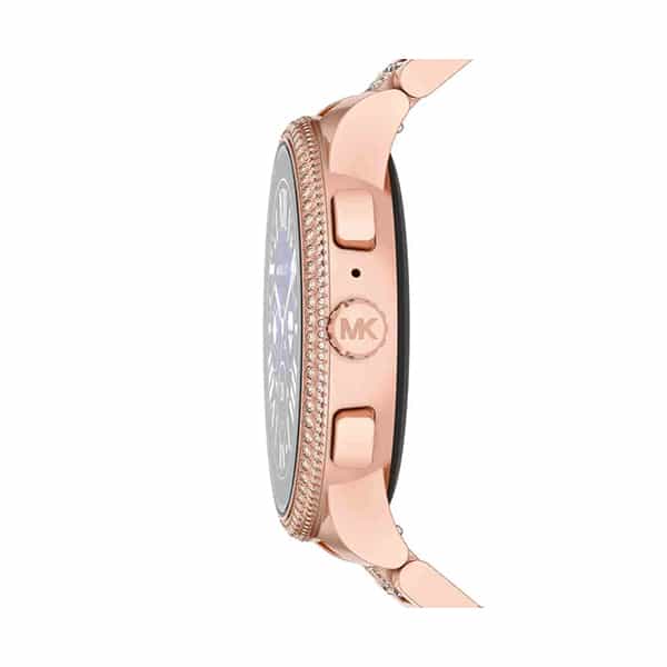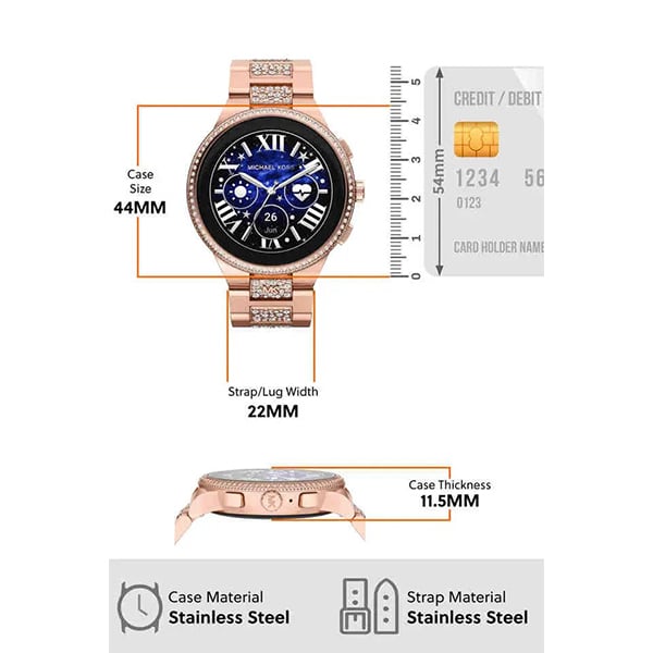 Michael Kors 44mm Gen 6 Camille Smartwatch pairs the latest Wear OS by Google technology with glamorous design, featuring a rose gold-tone stainless steel case with a pave topring and matching rose gold-tone stainless steel bracelet with stingray pave centerlinks. Wear OS by Google works with phones running the latest version of Android (excluding Go edition and phones without Google Play Store) or iOS. Supported features may vary between platforms and countries with compatibility subject to change. Compatible with iPhone and Android Phones. iPhone is a trademark of Apple, Inc. Android and Wear OS by Google are trademarks of Google LLC.