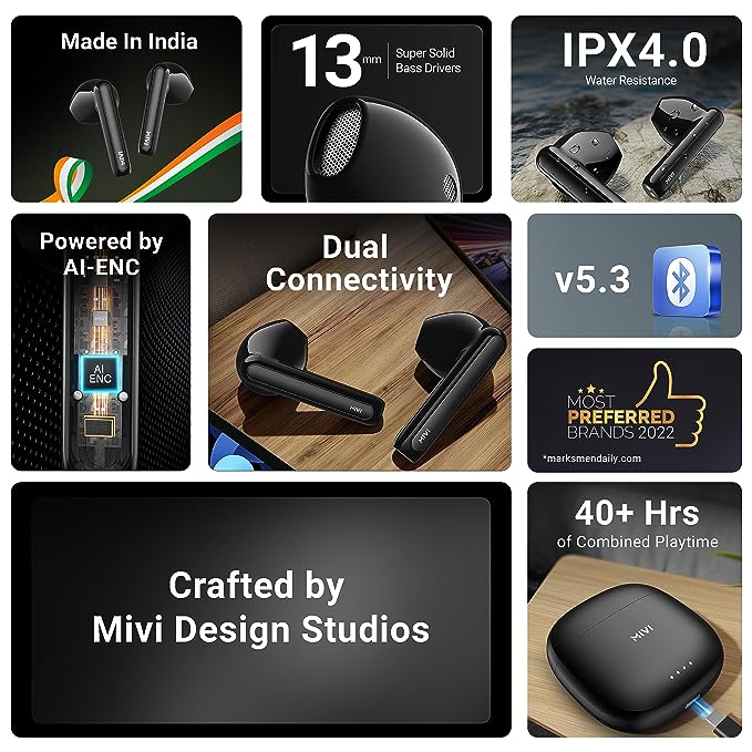 - Made in India: The earbuds are designed meticulously for comfort by Mivi Design Studio in India. Own the Indian-made and say with pride, “Mivi Apna Hai”. Say NO to wired earphones and join the revolution of ground-breaking TWS earbuds.