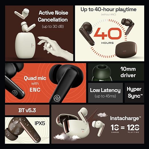 • Active Noise Cancellation (up to 30 dB): Immerse yourself in pure audio bliss and focus on your music without any distractions.Noise Buds Venus Truly Wireless Earbuds Noise Buds Venus Truly Wireless Earbuds