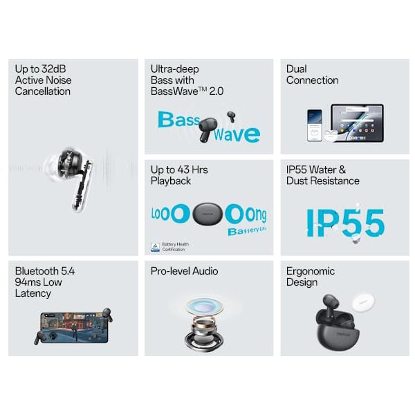 - [Battery Life & Fast Charging]:It has 10mins of Fast Charging that gives 11 hours of Playback time with total music playback up to 43 hours with ANC Off.