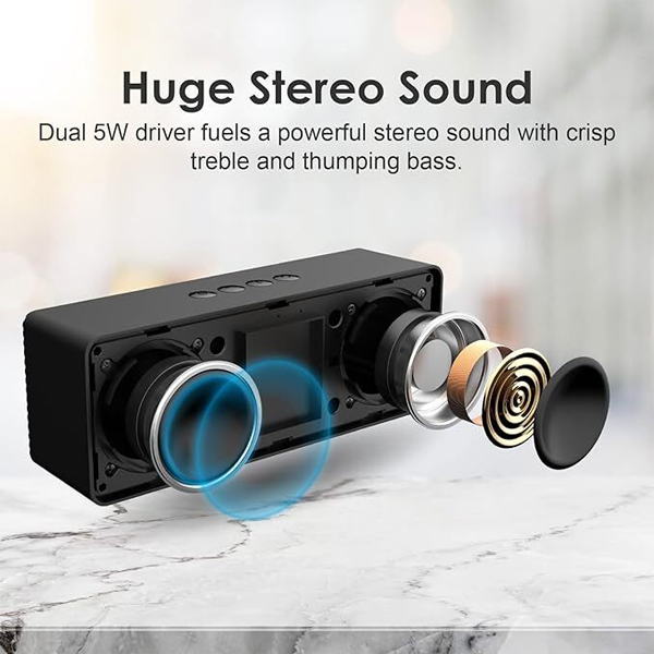- Huge Stereo Sound: Dual 5W driver fuels a powerful stereo sound with crisp treble and thumping bass.