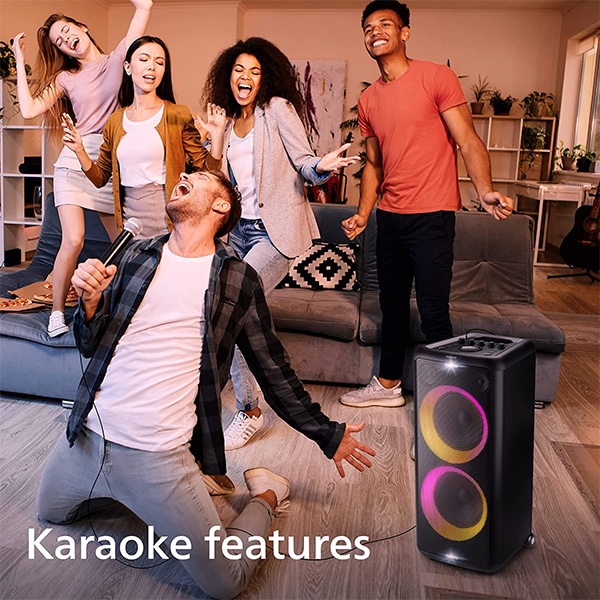 - Mic and guitar inputs. Karaoke effects | USB slot for music playback | Buttons on speaker for music control, lights, and more | Rotary knobs for mic, guitar, echo, treble, bass | AC-powered. Built-in battery for outside play | Trolley design with wheels and built-in handle.