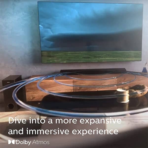 - DOLBY ATMOS: Created With Dolby Atmos technology, this soundbar with slim subwoofer will give you a cinematic sound that means allowing sounds to be interpreted as three-dimensional objects