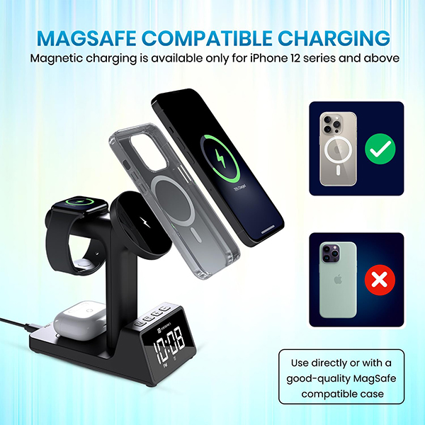 - All-New 3-in-1 MagSafe Wireless Charger with Built-In Alarm : Charge your Qi-compatible iPhones, iWatches, and AirPods wirelessly, all while keeping track of time with the built-in digital alarm clock.