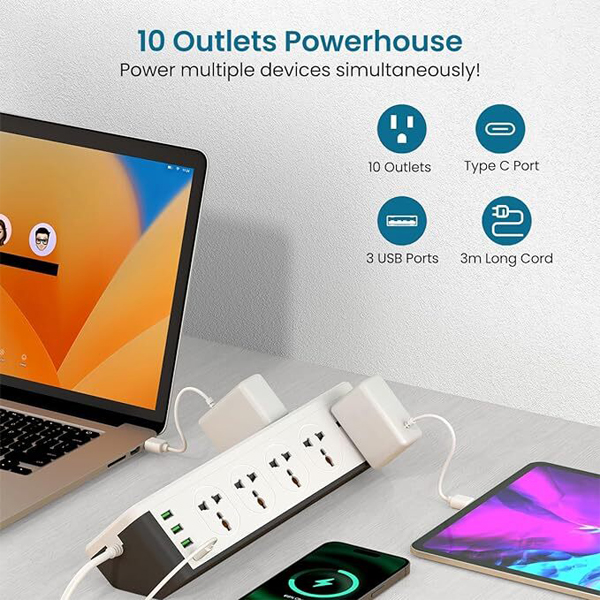 - 3-Meter Long Cord: Featuring a generous 3-meter long cord, it offers extended reach, allowing you to place it conveniently wherever you need power access without being restricted by outlet locations.