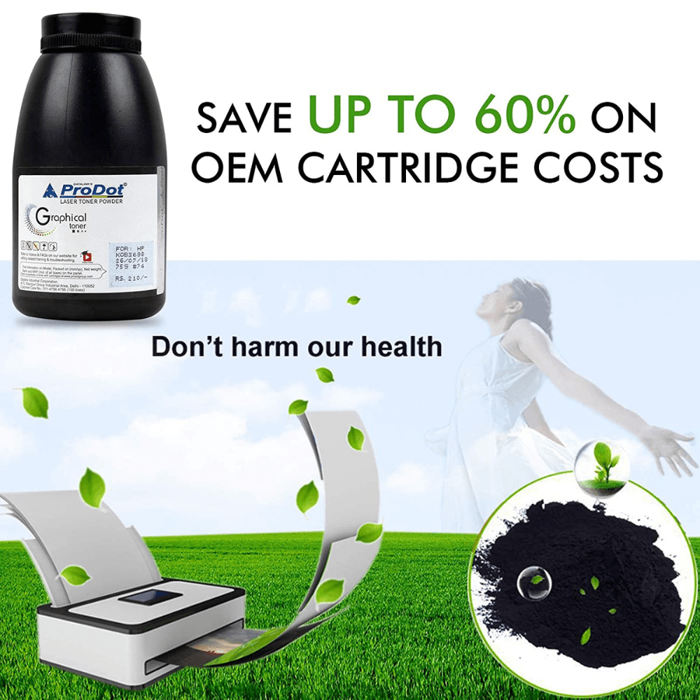 - Crystal clear prints- ProDot black laser toner is perfect for hassle-free refilling of toner cartridge of your HP LaserJet printers to ensure crisp, clear and retainable prints on a wide range of surface media