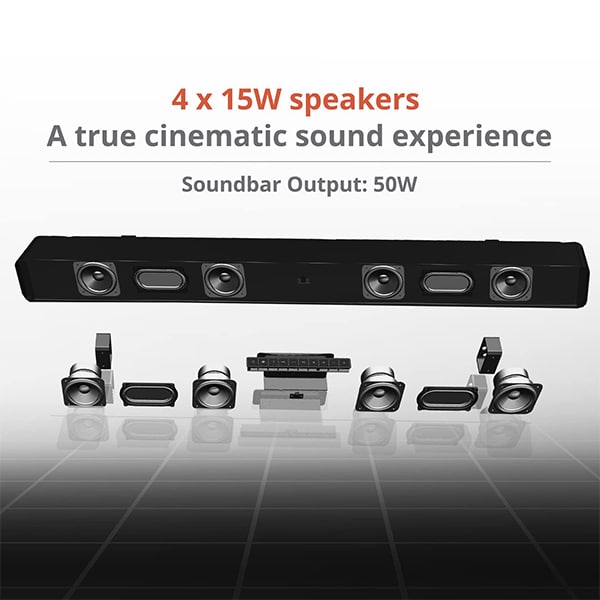 - Experience stereo surround sound & crystal clear balanced audio with 120W sound output, 2.1 channel soundbar with 4 powerful speakers of 50W and 70W wired subwoofer for enhanced deep Bass