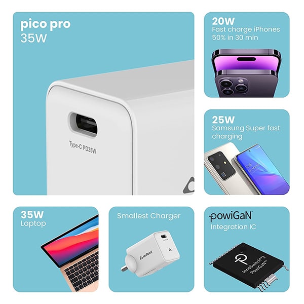 - [Small, Smaller, Smallest]: The Pico Pro is the smallest Made In India GaN charger there is. Its only 3 cm wide and 4.5 cm deep (excluding the pins), making it a super powerful pocket charger that you can use to charge almost every device you own.