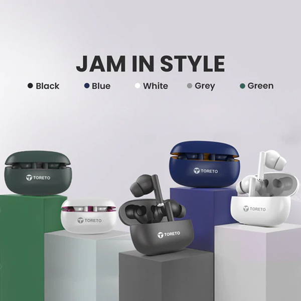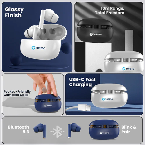 - Stylish & Ergonomic Design: The Toreto Air Tune earbuds come with a sleek, modern design that fits comfortably in your ears, making them ideal for long hours of usage. The compact charging case is lightweight and easy to carry in your pocket or bag. Available in multiple color options like Black, White, Blue, and Green, giving you the freedom to match your style. Designed with soft silicone ear tips for a secure and snug fit, suitable for workouts, travel, or daily use.