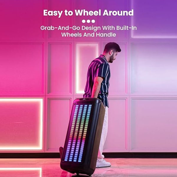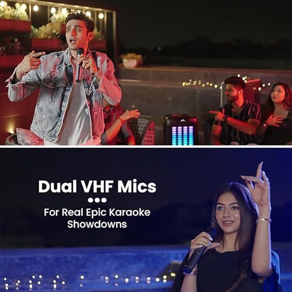 - The speaker comes with Two wireless karaoke mic, guitar & mic input, and multiple controls with a remote to customize your music experience.