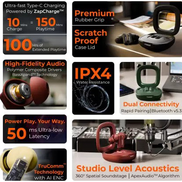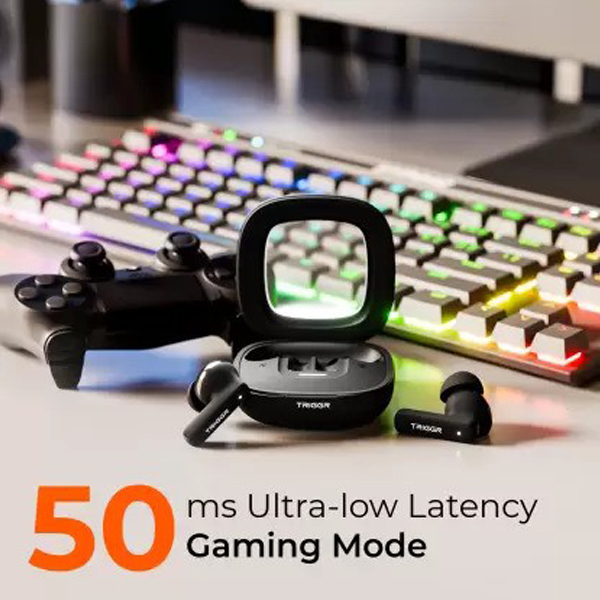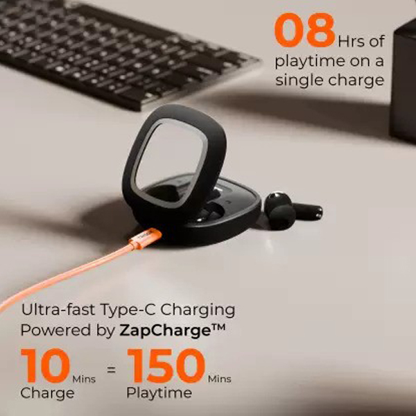 • long-lasting battery life, the TRIGGR Apex S1 ensures that you can enjoy uninterrupted music or calls for extended periods. On a full charge, the earbuds provide up to 6-8 hours of playback depending on usage. The charging case offers additional charges, allowing you to get up to 24-30 hours of total usage. It also supports quick charging, where just 10 minutes in the case provides up to 2 hours of playback time.